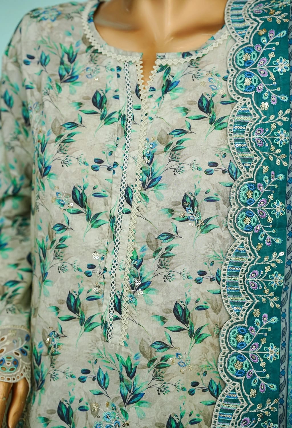 Elegant 3-piece lawn suit featuring laser kari embroidery with delicate appliqué work, paired with a matching trouser and dupatta.