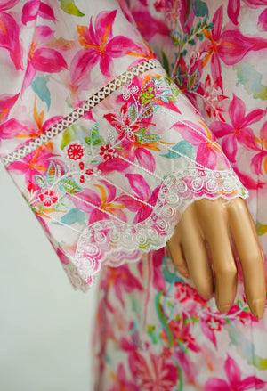 Elegant 3-piece lawn suit featuring laser kari embroidery with delicate appliqué work, paired with a matching trouser and dupatta.