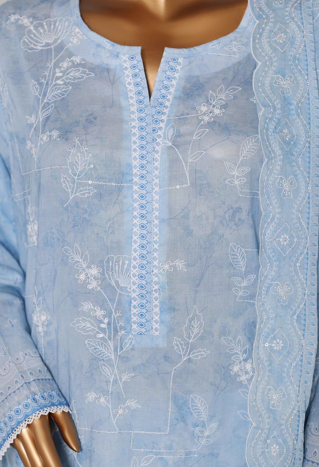 Embroidered shirt paired with an embroidered trouser and embroidered dupatta.